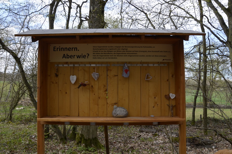 Leider halten sich einige wenige Menschen jedoch nicht an die in der Benutzungsordnung festgelegten Regeln und hängen oder legen Gegenstände aller Art an den Bestattungsbaum oder pflanzen waldfremde Gewächse in Baumnähe.